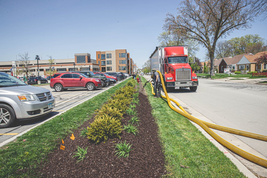 - Bulk mulch, topsoil, and gravel are delivered with a medium-sized dump truck.